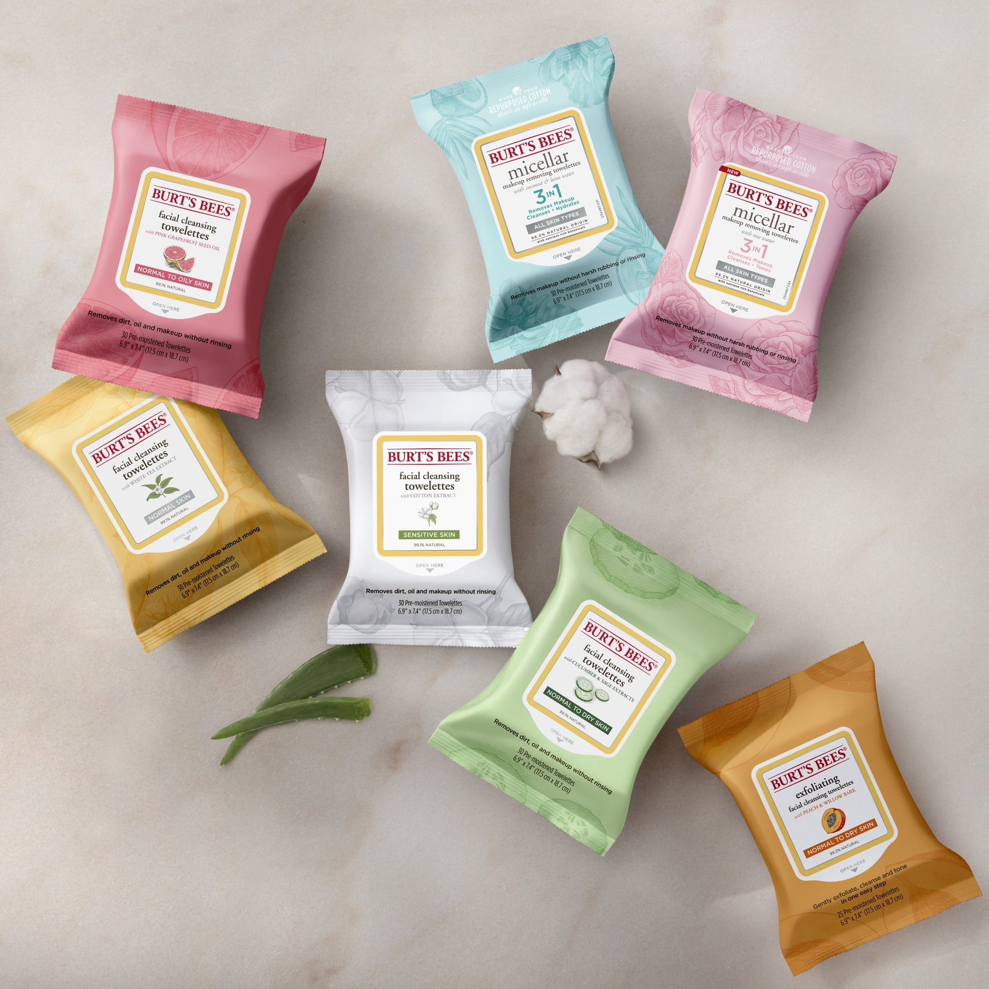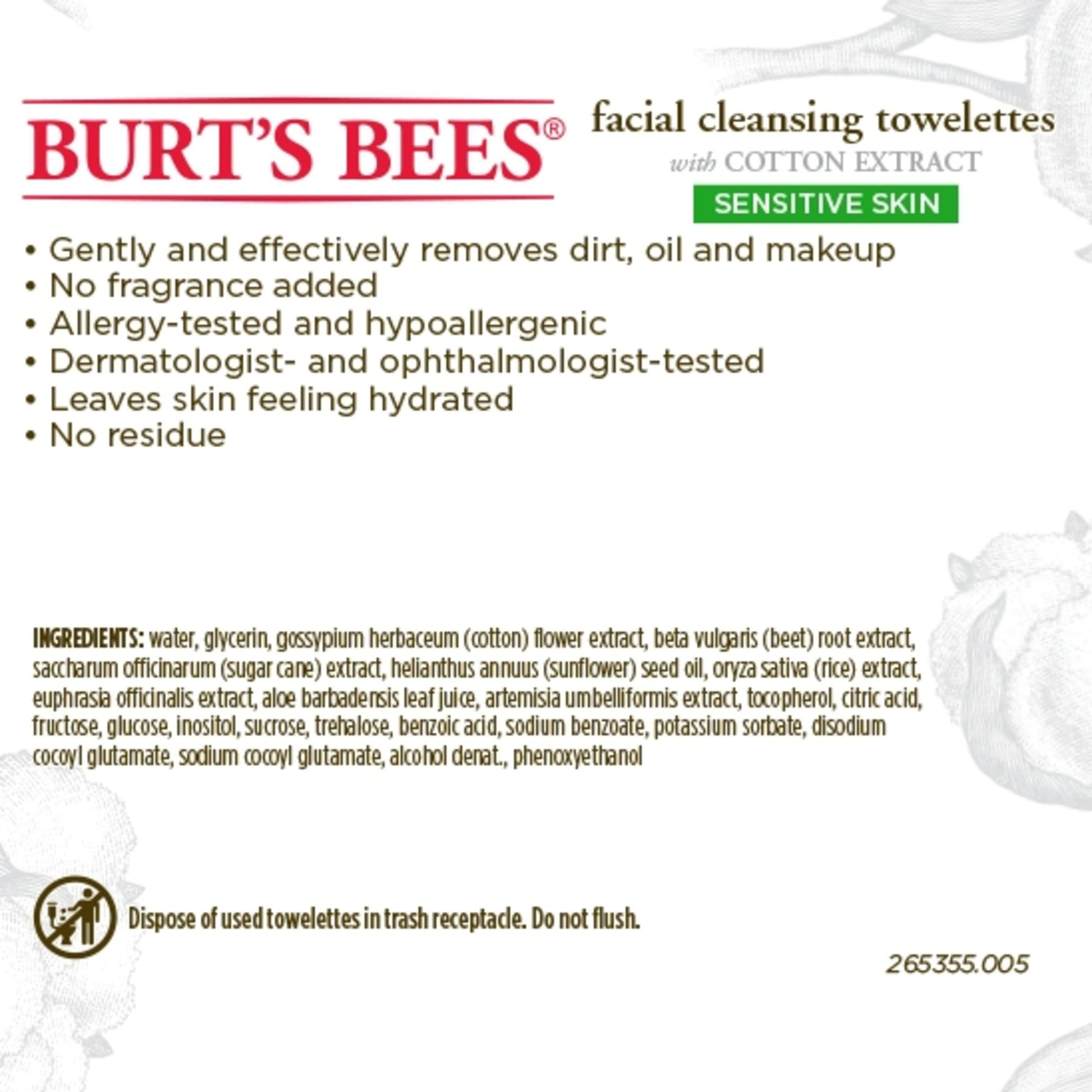 - FACIAL CLEANSER: Infused with extracts from aloe, cotton and rice, Burt's Bees cleansing facial towelette wipes for sensitive skin will leave your skin feeling soft and clean