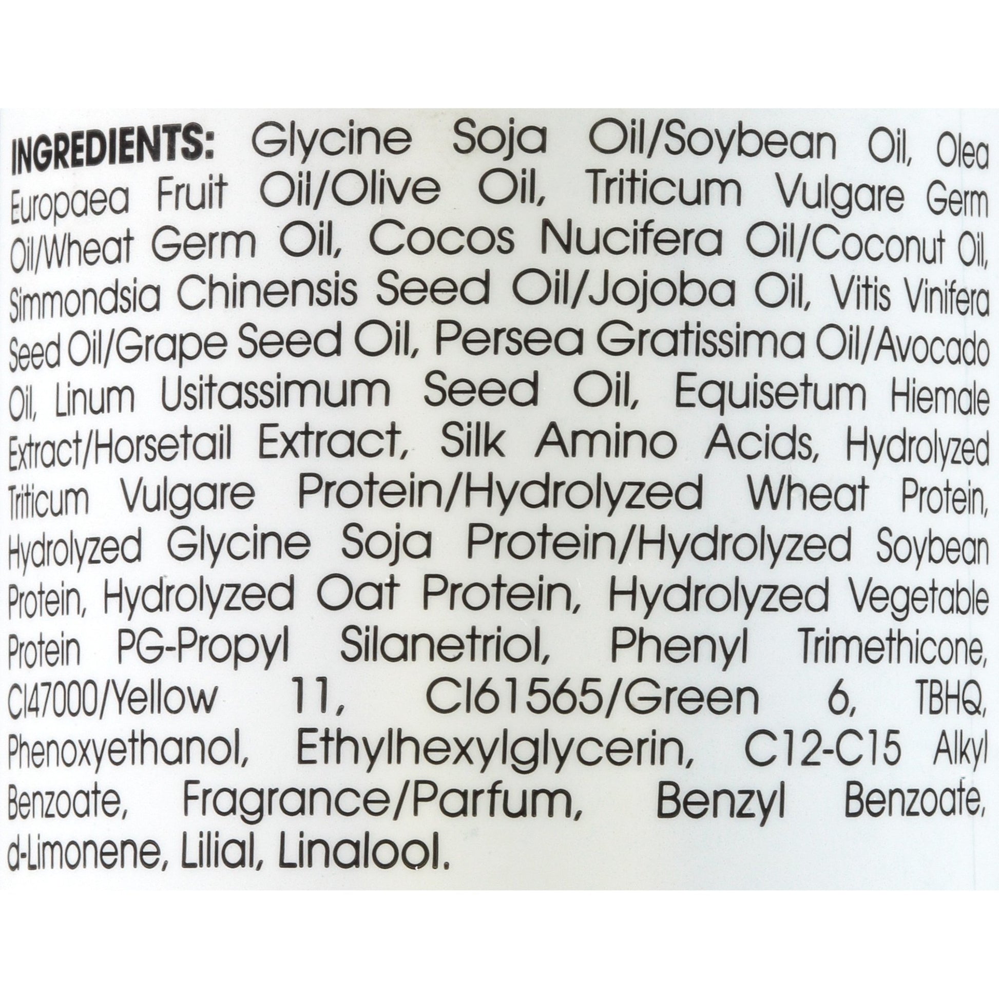Ingredients: Glycine Soja Oil/Soybean Oil, Olea Europaea Fruit Oil/Olive Oil, Tritcum Vulgare Germ Simmondsia Chinensis Seed Oil/Jojoba Oil, Vitis Vinifera Seed Oil/Grape Seed Oil, Persea Gratissima Oil/Avocado Oil, Linum Usitassimum Seed Oil, Equisetum Hiemale Extract/Horsetail Extract, Silk Amino Acids, Hydrolyzed Triticum Vulgare Protein/Hydrolyzed Wheat Protein, Hydrolyzed Glycine Soja Protein/Hydrolyzed Soybean Protein, Hydrolyzed Oat Protein, Hydrolyzed Vegetable Protein, PG-Propyl Silanetriol, Phenyl Trimethicone, Cl47000/Yellow 11, Cl61565/Green 6, TBHQ, Phenoxyethanol, Ethylhexylglycerin, C12-C15 Alkyla Benzoate, Fragrance/Parfum, Benzyl Benzoate, D-Limonene, Lilial, Linalool.