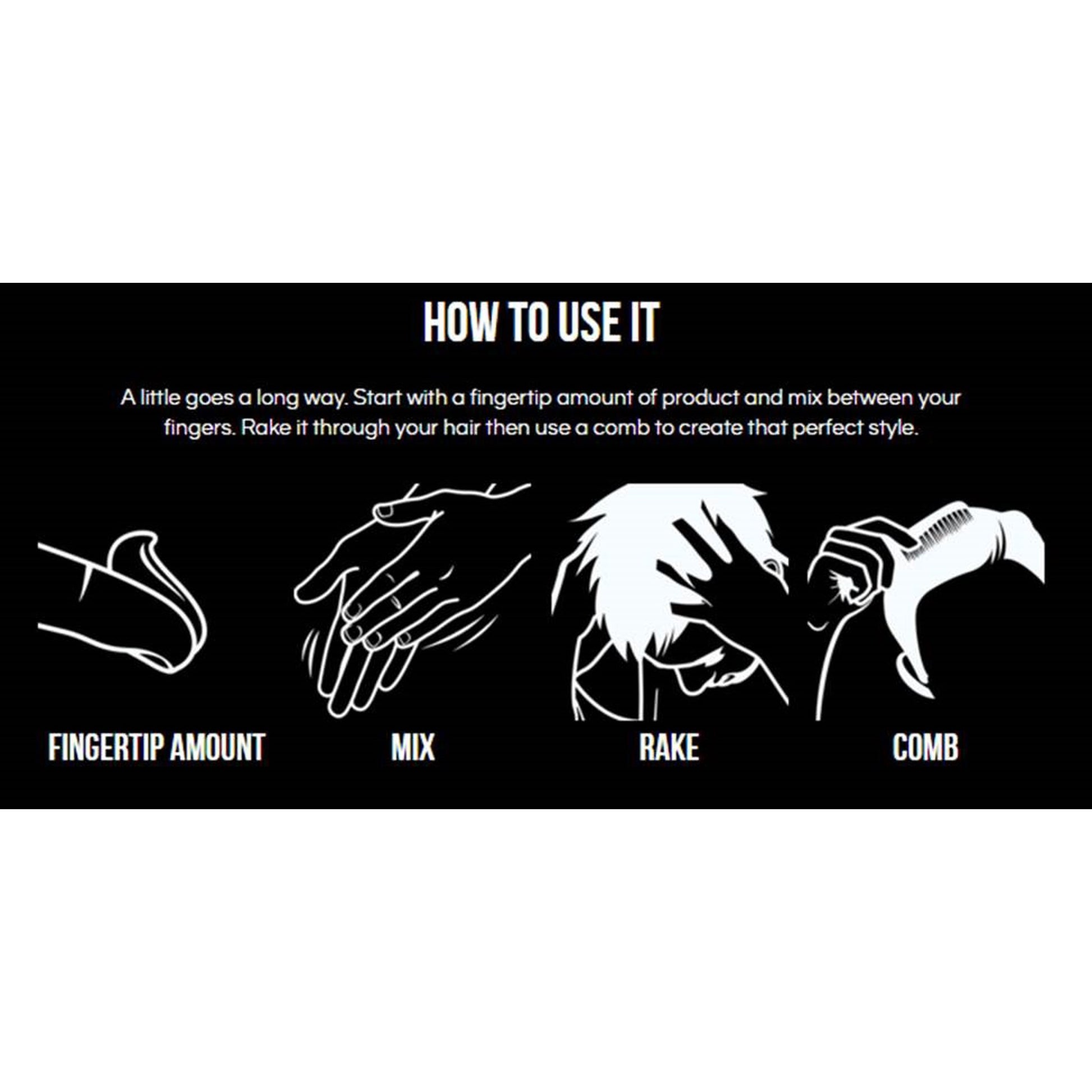 Instructions: A little goes a long way. Start with a fingertip amount of product and mix between your fingers. Rake it through your hair then use a comb to create that perfect style.
