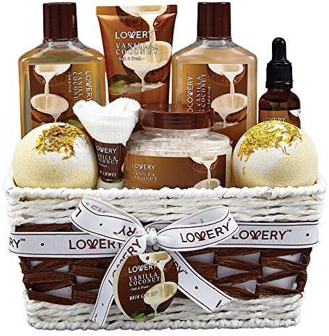 Bath and Body Gift Basket For Women and Men – 9 Piece Set of Vanilla Coconut Home Spa Set, Includes Fragrant Lotions, Extra Large Bath Bombs, Coconut Oil, Luxurious Bath Towel & More