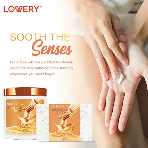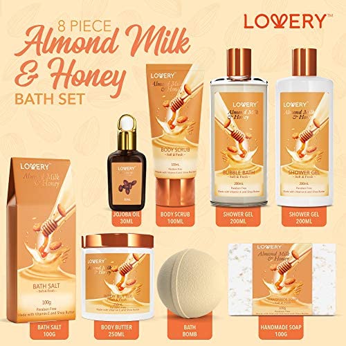 Bath Gift Set - Almond Milk and Honey Spa Kit Includes Shower Gel, Bath Bomb, Bubble Bath, Body Scrub, Salts, Body Butter, Jojoba Oil & Handmade Oatmeal Soap
