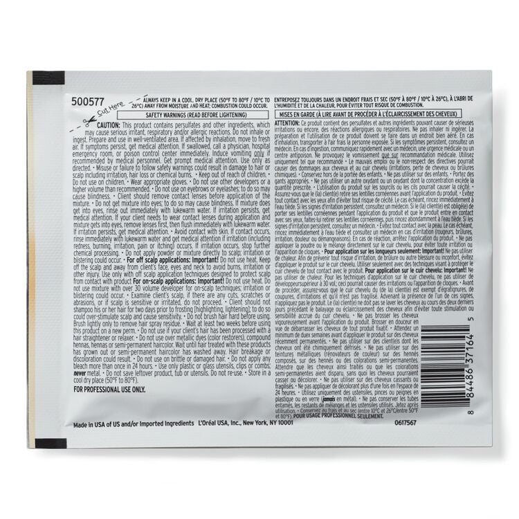 OFF-SCALP APPLICATIONS: Mix 1oz. (1 packet) with 1oz. (30ml) or 2oz. (60ml) Oreor 20, 30 or 40 Volume Creme Developer. Process up to 50 minutes determined according to the desired results. Do not use heat. Use only with the recommended developer, maximum 40 volume (12%).