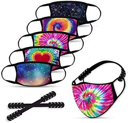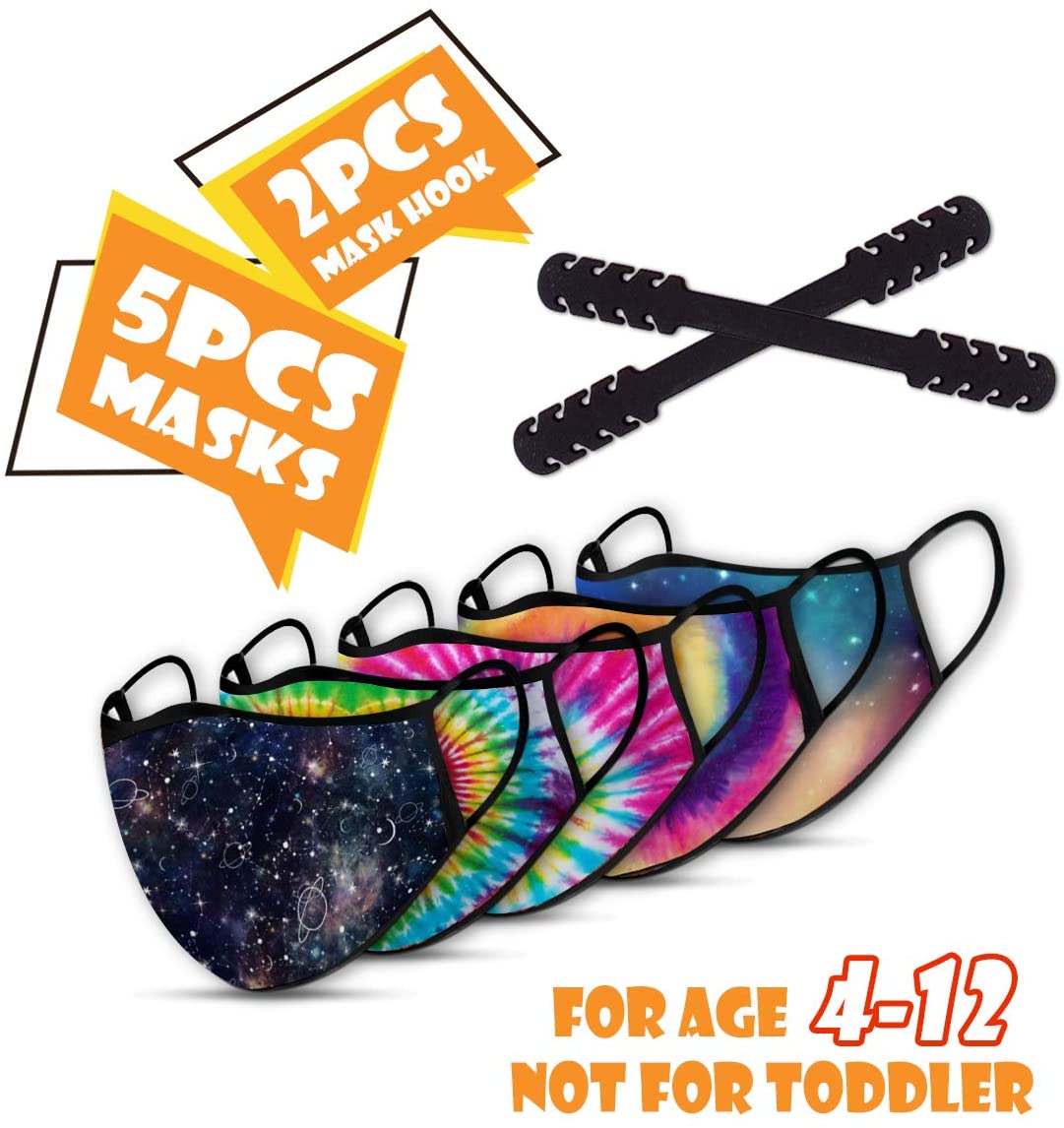 Big Kids Reusable Face Mask, 5pcs Washable Face Mask with 2 Adjustable Mask Extender Strap, Students Cloth Face Mask, Safety 2 Layers Face Cover for Teens Ages 4-12 (Kids-5PCSs-Tie Dye)