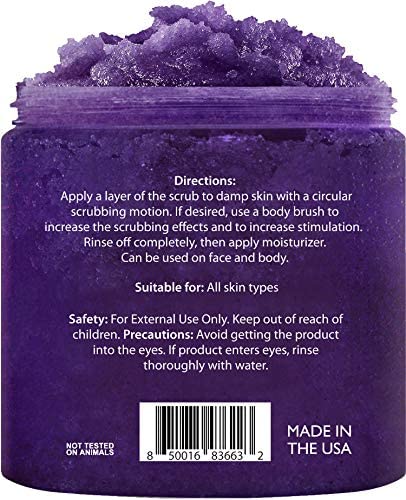 - LAVENDER BODY SCRUB FOR ALL SKIN TYPES – Our Lavender Scrub is suitable for oily skin, dry skin and everything in between. This spa quality body scrub for women and men can gently moisturize your skin to help result in soft and glowing skin. Apply the scrub to wet skin and massage gently with your fingertips in a circular motion for approximately 5 minutes. Rinse thoroughly and pat dry.