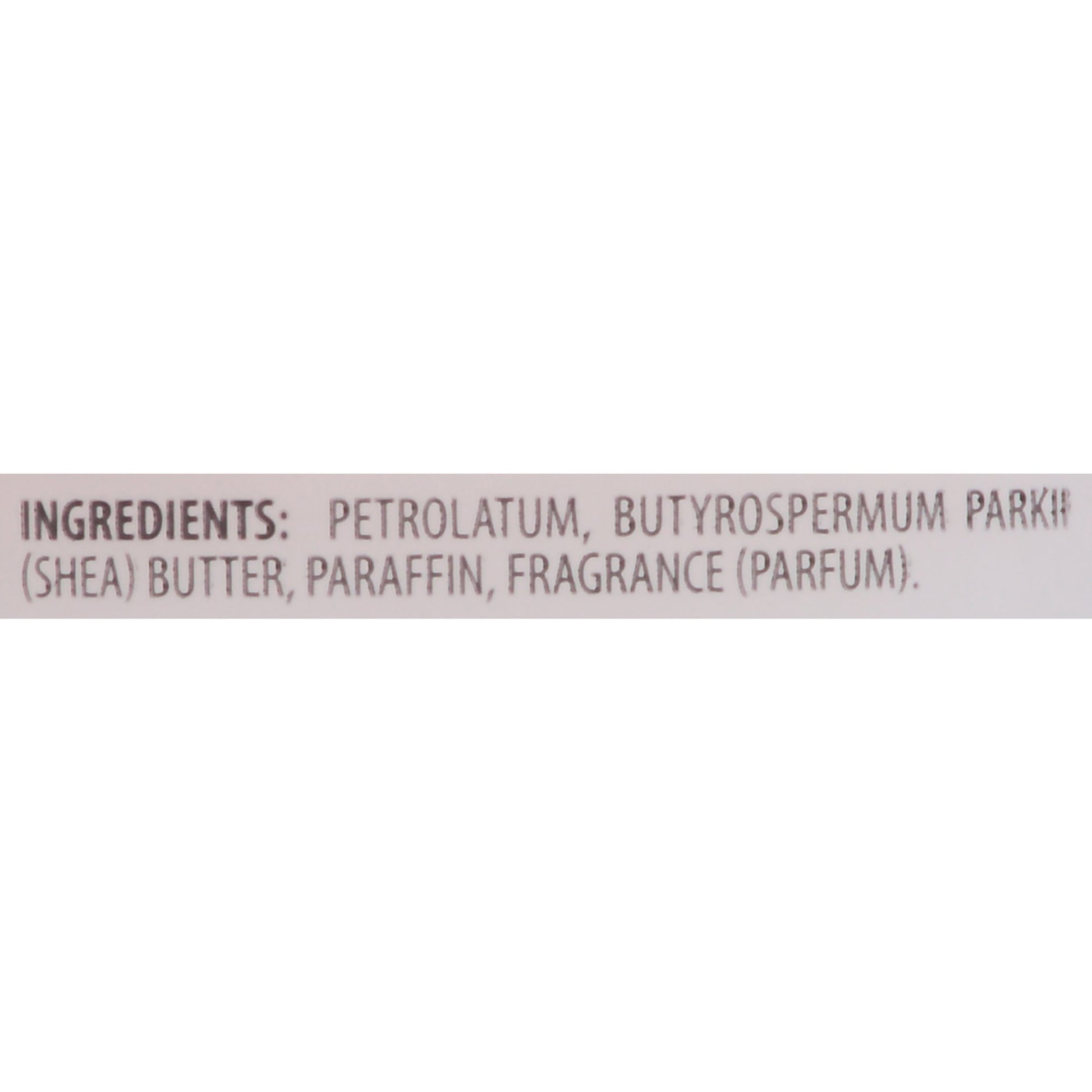 Ingredients: Petrolatum, Butyrospermum Parkii (Shea Butter), Paraffin, Fragrance (Parfum), Benzyl Salicylate, Limonene, Hexyl Cinnamal, Linalool, Butylphenyl Methylpropional, Coumarin.