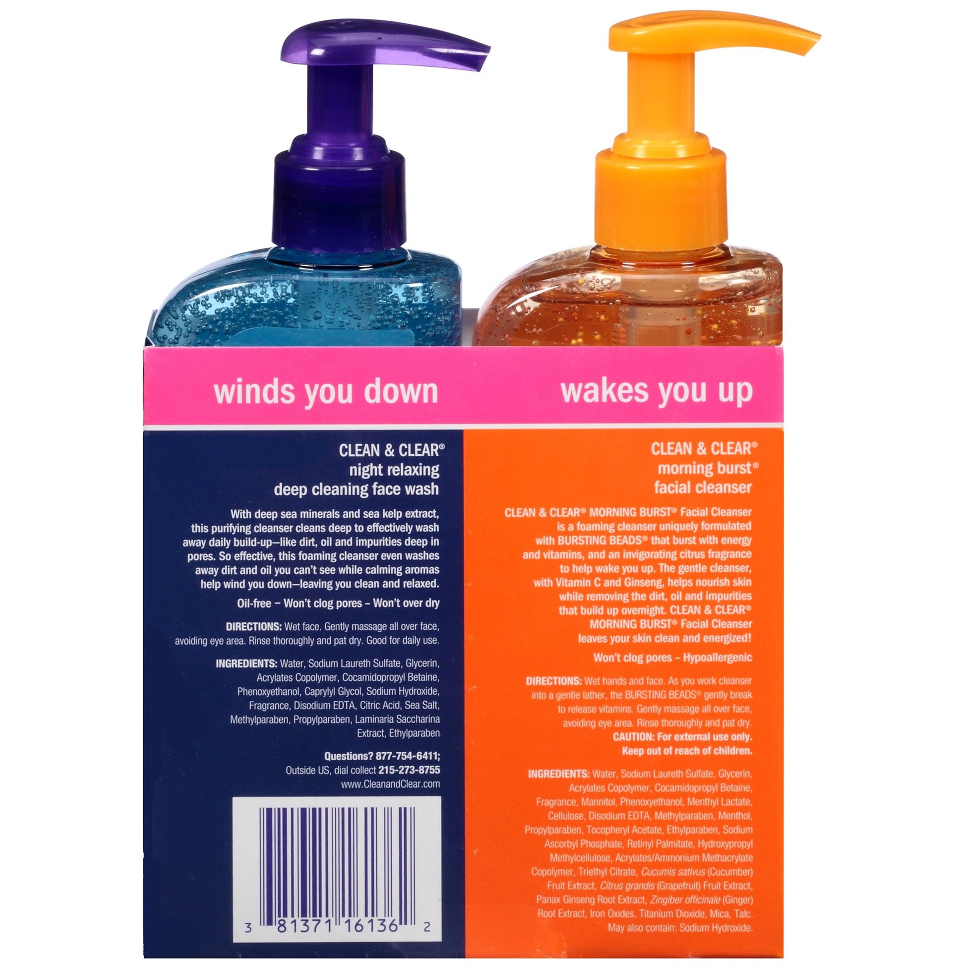 Instructions: CLEAN & CLEAR® night relaxing deep cleaning face wash Wet face. Gently massage all over face, avoiding eye area. Rinse thoroughly and pat dry. Good for daily use. CLEAN & CLEAR® morning burst® facial cleanser Wet hands and face. As you work cleanser into a gentle lather, the BURSTING BEADS® gently break to release vitamins. Gently massage all over face, avoiding eye area. Rinse thoroughly and pat dry.