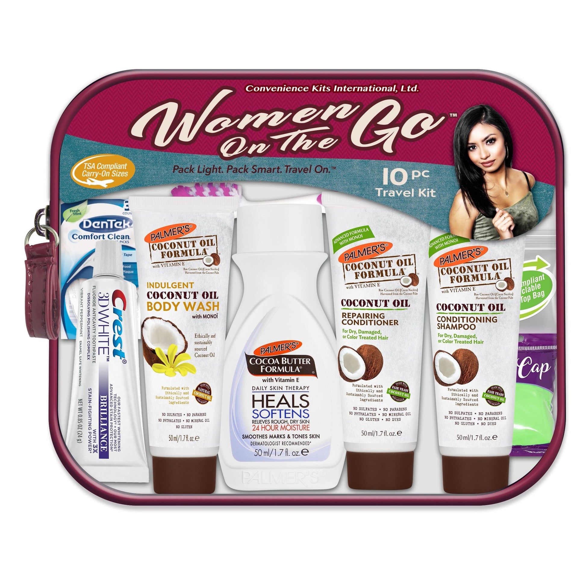 Women’s Multicultural 10 PC Travel Kit includes: Palmer's Coconut Oil Conditioning Shampoo 1.7 oz., Palmer's Coconut Oil Repairing Conditioner 1.7 oz., Shower Cap, Palmer's Coconut Oil Body Wash 1.7 oz., Palmer's Coconut Oil Lotion 1.7 oz., Crest Toothpaste .85 oz., Adult Toothbrush, Toothbrush Cap, Dentek Flossers 3 ct., TSA Compliant Quart Size Zip Top Bag in a Deluxe Red Stitched Clear Toiletry Zippered Bag with Handle.Share