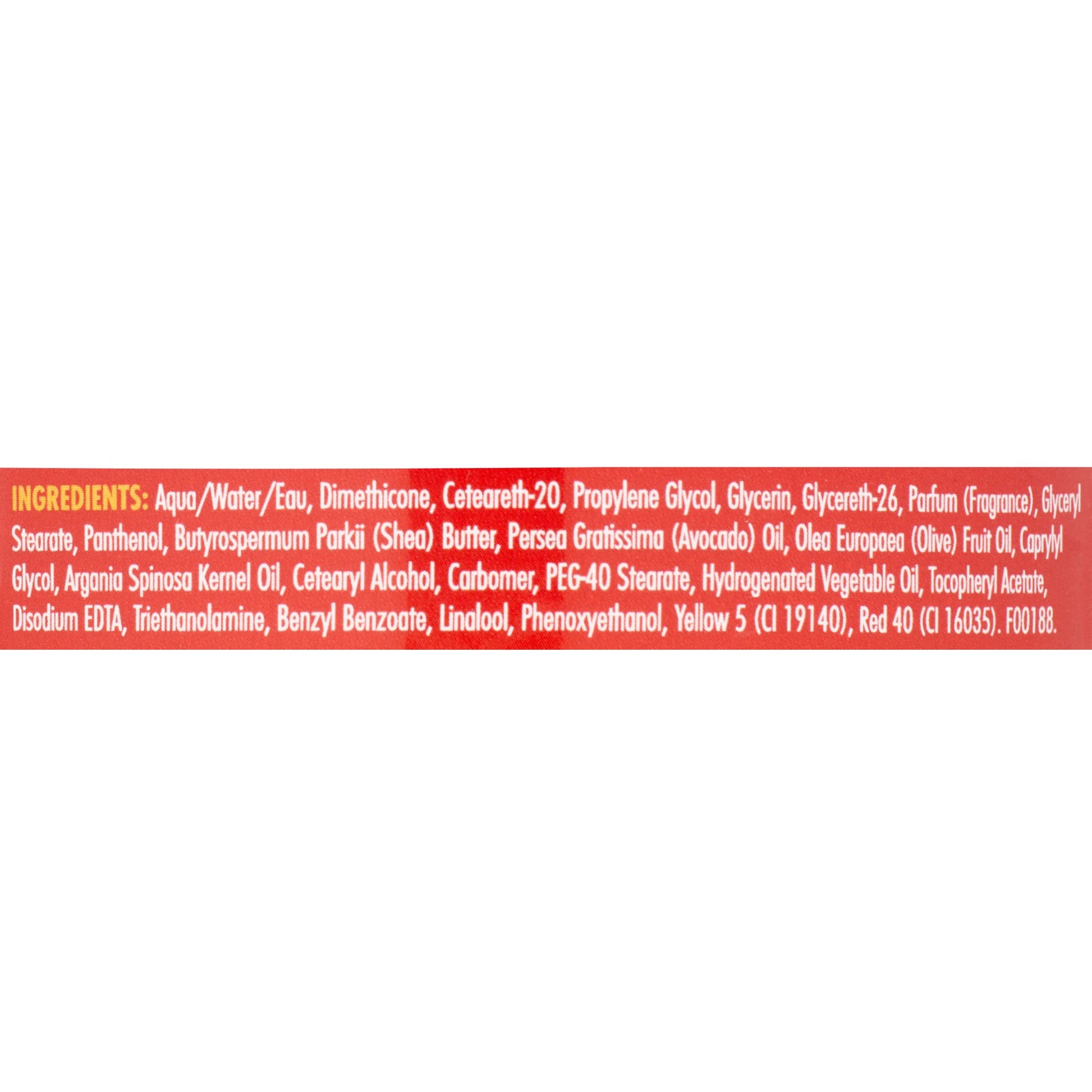 Ingredients: Water, Dimethicone, Ceteareth-20, Propylene Glycol, Glycerin, Glycereth-26, Fragrance, Cetearyl Alcohol, Carbomer, Glyceryl Stearate, Argania Spinosa Kernel Oil, Butyrospermum Parkii (Shea) Butter, Persea Gratissima (Avocado) Oil, Olea Europaea (Olive) Fruit Oil, Hydrogenated Vegetable Oil, Panthenol, PEG-20 Stearate, Disodium EDTA, Tocopheryl Acetate, Triethanolamine, Benzyl Benzoate, Linalool, Diazolidinyl Urea, Methylisothiazolinone, CI 19140 (Yellow 5), CI 16035 (Red 40).