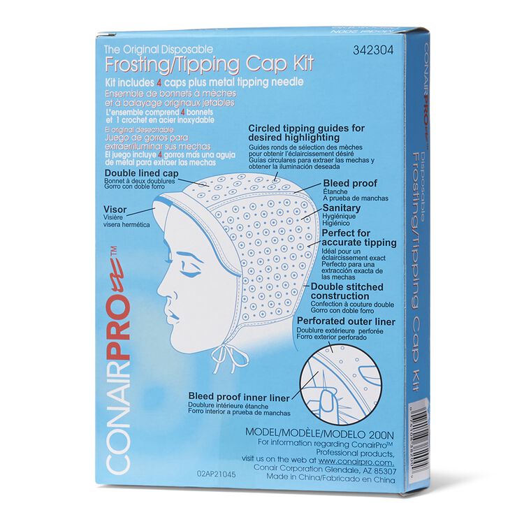 The Conair Pro Frosting/Tipping Cap Kit is a protective cap for frosting and tipping hair. Prevents drips or bleeding and gives precise results. The double lined cap features a perforated outer liner and protective inner liner and is bleed- proof.