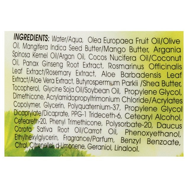 Ingredients: Water/Aqua, Olea Europaea Fruit Oil/Olive Oil, Mangifera Indica Seed Butter/Mango Butter, Argania Spinosa Kernel Oil/Argan Oil, Cocos Nucifera Oil/Coconut Oil, Panax Ginseng Root Extract, Rosmarinus Officinalis Leaf Extract/Rosemary Extract, Aloe Barbadensis Leaf Extract/Aloe Vera Extract, Butyrospermum Parkii/Shea Butter, Tocopherol, Glycine Soja Oil/Soybean Oil, Propylene Glycol, Dimethicone, Acrylamidopropyltrimonium Chloride/Acrylates Copolymer, Glycerin, Polyquaternium-37, Propylene Glycol Dicaprylate/Dicaprate, PPG-1 Trideceth-6, Cetearyl Alcohol, Ceteareth-20, Phenyl Trimethicone, Polysorbate-20, Daucus Carota Sativa Root Oil/Carrot Oil, Phenoxyethanol, Ethylhexylglycerin, Fragrance/Parfum, Benzyl Benzoate, Citral, Citronellol D-Limonene, Geraniol, Linalool.