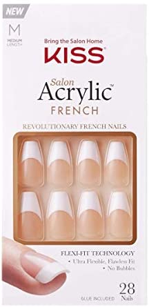 KISS Salon Acrylic French Nail Manicure Set, Medium Length, Square, “Je T'aime”, Nail Kit Includes Pink Gel Nail Glue (Net Wt. 2 g / 0.07oz.), Mini File, Manicure Stick, and 28 Fake Nails