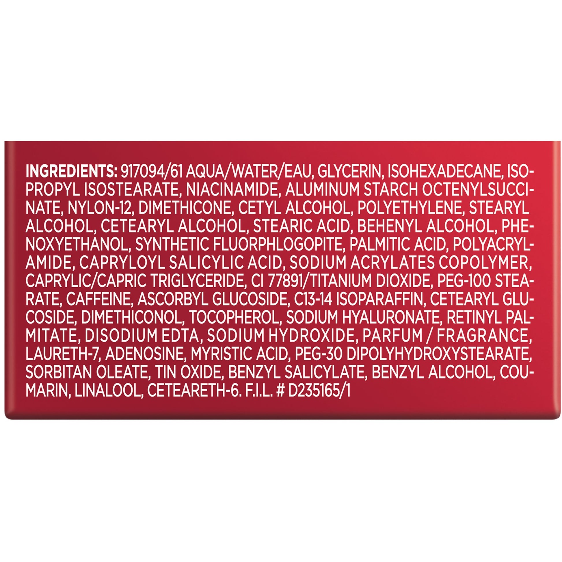 Ingredients: AQUA / WATER, GLYCERIN, ISOHEXADECANE, ISOPROPYL ISOSTEARATE, HYDROXYPROPYL, TETRAHYDROPYRANTRIOL, ALUMINUM STARCH, OCTENYLSUCCINATE, PROPYLENE GLYCOL, NYLON-12OCTYLDODECANOL, CETYL ALCOHOL, AMMONIUM POLYACRYLDIMETHYLTAURAMIDE / AMMONIUM POLYACRYLOYLDIMETHYL TAURATEBEHENYL ALCOHOL, DIMETHICONEC13-14 ISOPARAFFIN, PEG-100 STEARATESTEARIC ACIDSTEARYL ALCOHOLARACHIDYL ALCOHOLTRIETHANOLAMINECETEARYL ALCOHOLCETEARYL GLUCOSIDESODIUM HYALURONATEPALMITIC ACIDADENOSINEDISODIUM EDTADISODIUM STEAROYL GLUTAMATEHYDROLYZED HYALURONIC ACIDCAPRYLOYL SALICYLIC ACIDLAURETH-7POLYACRYLAMIDEPOLYETHYLENEMETHYLISOTHIAZOLINONEMETHYLPARABENPHENOXYETHANOLCI 15985 / YELLOW 6CI 19140 / YELLOW 5CI 77891 / TITANIUM DIOXIDEMICALINALOOLISOEUGENOLLIMONENECITRONELLOLBENZYL ALCOHOLPARFUM / FRAGRANCE