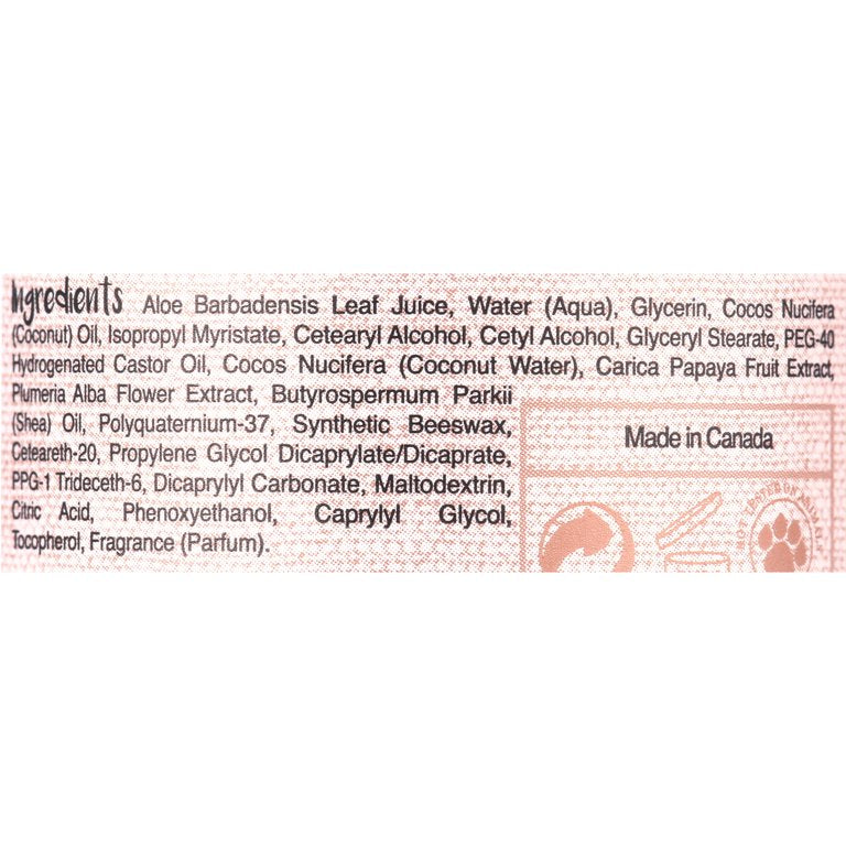 - Blend with 100% aloe as the first ingredient, along with coconut oil & papaya & plumeria extracts