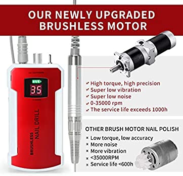- Compared with an ordinary nail drill machine, this newly upgraded brushless electric nail drill professional is smoother, very low noise and vibration for smooth and long-time operation. making your experience more comfortable. The service life exceeds 1000 hours. With an LCD display, it can show clearly the speed and battery power remaining.