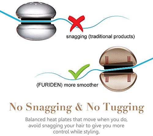 - NO SNAGGING & NO TUGGING: FURIDEN 360°swivel long cord flat iron for women with floating plates and balanced heat plates that move when you do. The floating plates with curved edges continuously adjust the angle to avoid snagging your hair to give you more control while styling.