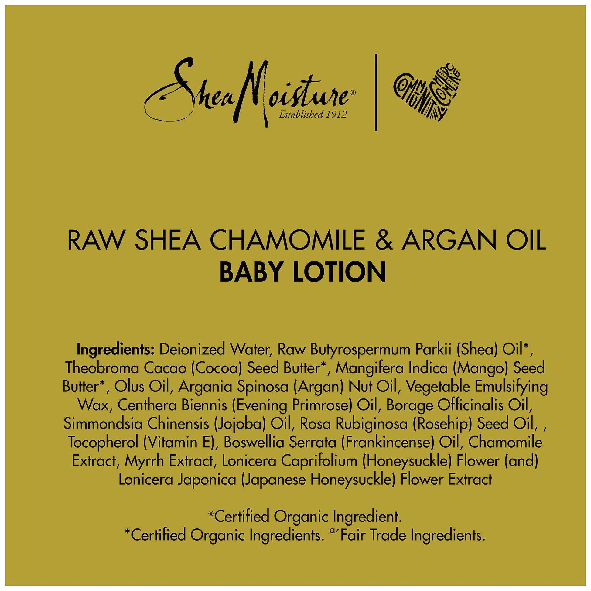 - Shea Moisture Raw Shea, Chamomile & Argan Oil Baby Lotion has no sulfates, No parabens, No phthalates, No propylene glycol, No mineral oil, No animal testing and No petroleum