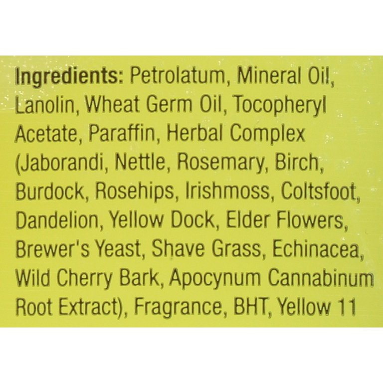 A light, non-greasy treatment enriched with natural herbs, wheat germ oil, Vitamin E, and lanolin to provide gloss and manageability for your hair that helps soften and condition hair.