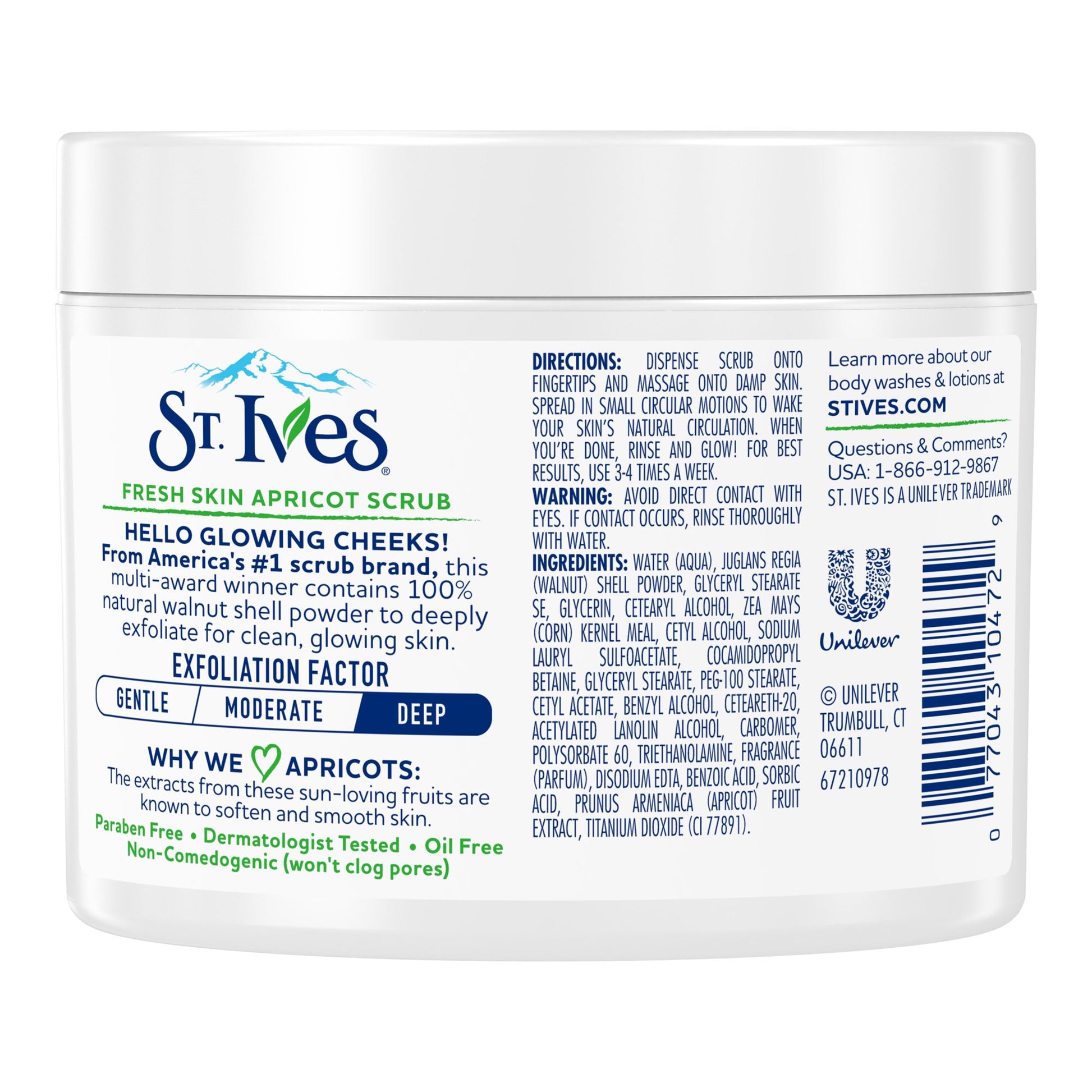 Ingredients: Water, Juglans Regia (Walnut) Shell Powder, Glyceryl Stearate, Glycerin, Cetearyl Alcohol, Zea Mays (Corn) Kernel Meal, Cetyl Alcohol, Sodium Lauryl Sulfoacetate, Cocamidopropyl Betaine, Glyceryl Stearate, PEG-100 Stearate, Cetyl Acetate, Benzyl Alcohol, Ceteareth-20, Acetylated Lanolin Alcohol, Carbomer, Polysorbate 60, Triethanolamine, Fragrance (Parfum), Disodium EDTA, Benzoic Acid, Sorbic Acid, Prunus Armeniaca (Apricot) Fruit Extract, Titanium Dioxide (CI 77891).