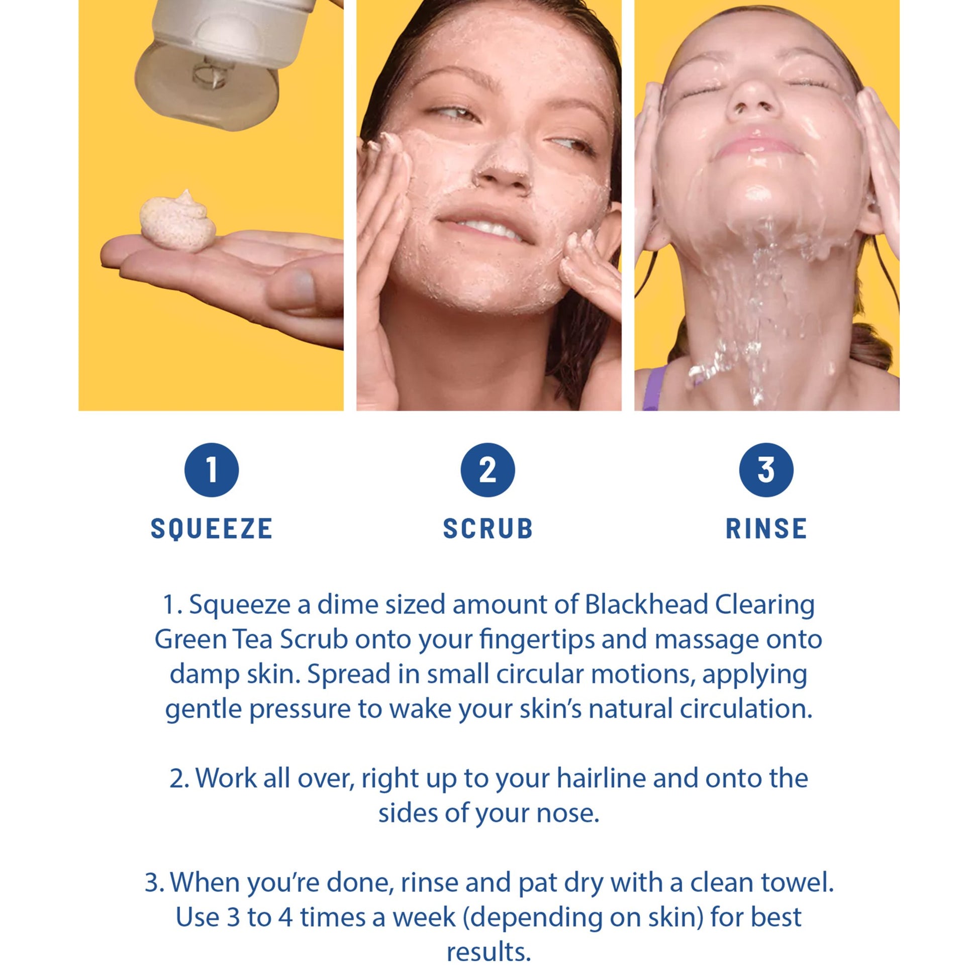 Instructions: Squeeze a dime sized amount of scrub onto your fingertips and massage onto damp skin. Spread in small circular motions, applying gentle pressure to wake your skin?s natural circulation. Work all over, right up to your hairline and onto the sides of your nose. When you?re done, rinse and pat dry with a clean towel.