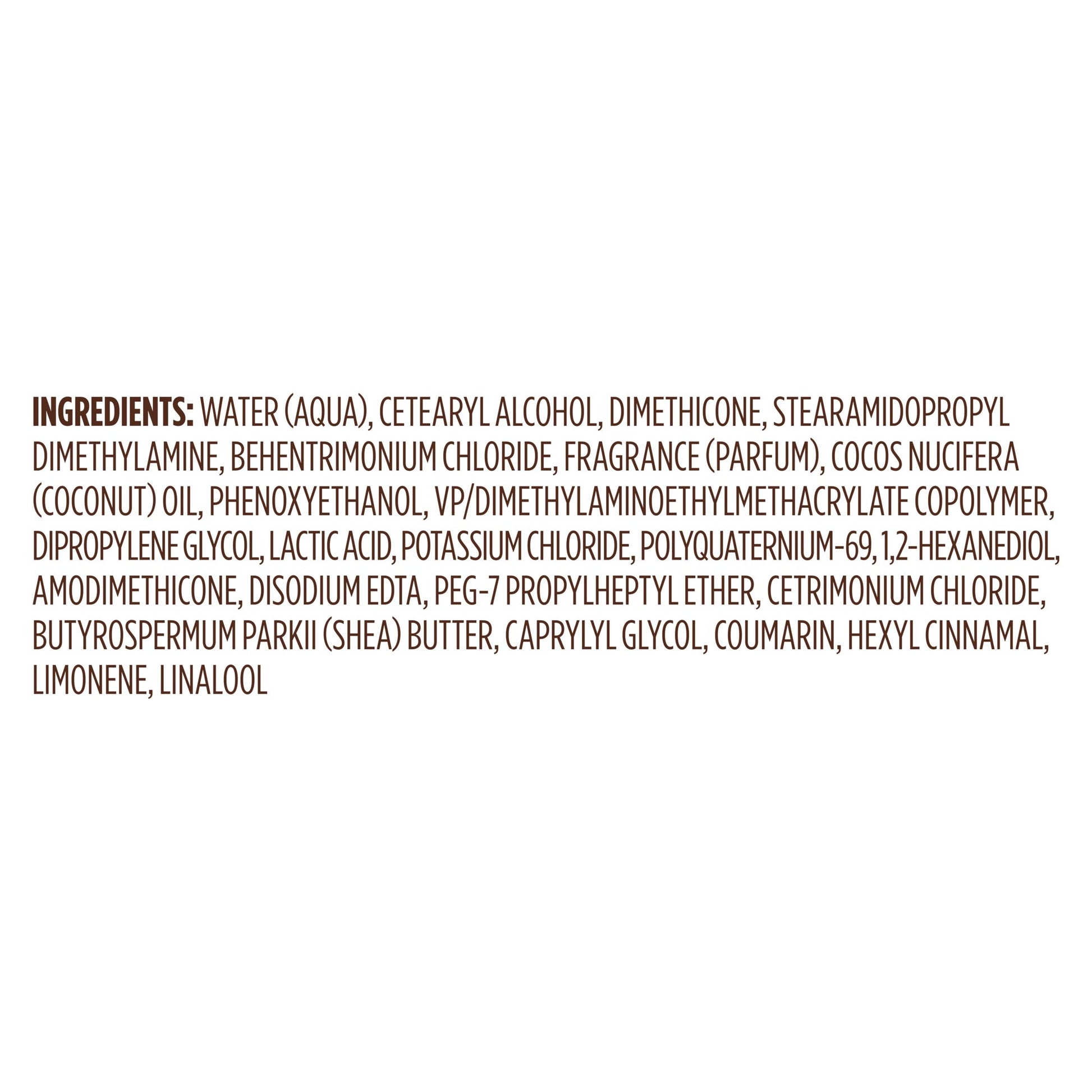 Ingredients: Water (Aqua), Cetearyl Alcohol, Dimethicone, Stearamidopropyl Dimethylamine, Behentrimonium Chloride, Fragrance (Parfum), Cocos Nucifera (Coconut) Oil, Phenoxyethanol, Vp/Dimethylaminoethylmethacrylate Copolymer, Dipropylene Glycol, Lactic Acid, Potassium Chloride, Polyquaternium-69, 1.2-Hexanediol, Amodimethicone, Disodium Edta, Peg-7 Propyl Heptyl Ether, Cetrimonium Chloride, Butyrospermum Parkii (Shea) Butter, Caprylyl Glycol, Coumarin, Hexyl Cinnamal, Limonene, Linalool.