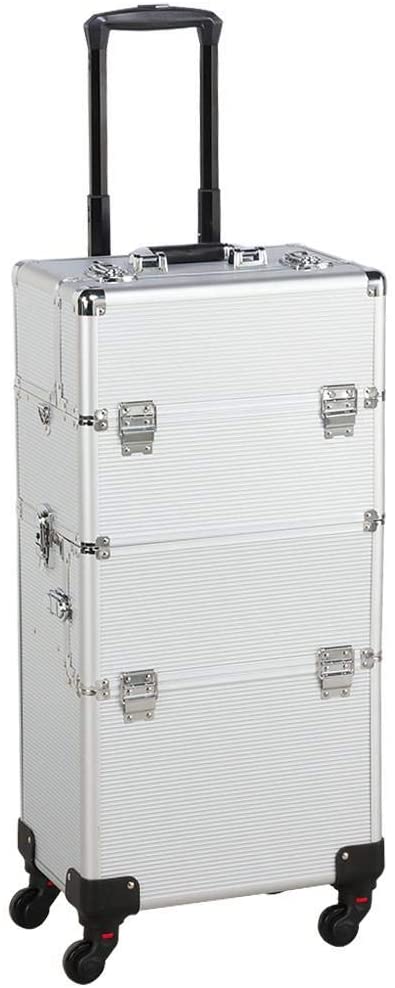 Yaheetech 3 in 1 Cosmetic Rolling Makeup Train Case Large Aluminum Trolley Makeup Travel Case Professional Rolling Cosmetic Beauty Storage, with 360° Swivel Wheels